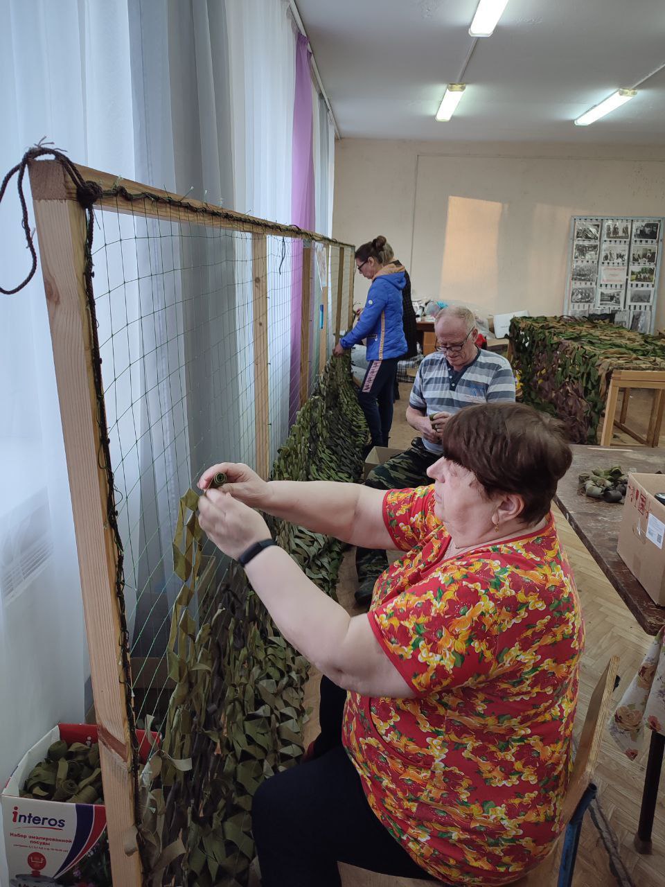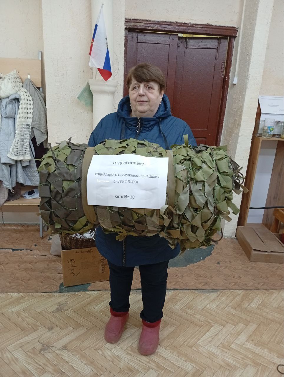 В с. Зубилиха социальные работники ГБУ "КЦСОН Краснобаковского муниципального округа" изготовили очередную маскировочную сеть для отправки в зону действия СВО